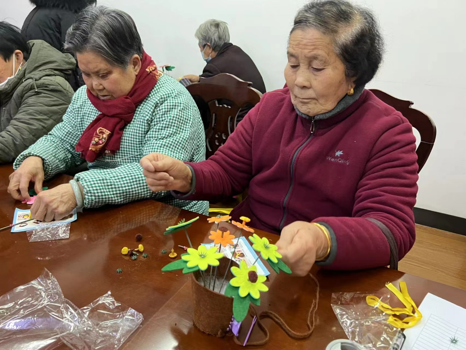活动开始后,民欣社工先带领现场的老人们一起做手指操,让老人们活跃手指,增加手指的灵活度,可爱的动作引得第一次参与活动的老年人开怀大笑。到了动手环节,开始时大家小问题不断,现场不时有人举手提问,“小程,帮我看看这样行不行、下一步要怎么做”......有些老年人觉得无从下手,民欣社工耐心地通过边讲解边演示的方式向他们展示制作窍门。经过一段时间的练习后,老年人渐渐掌握了技巧,分工合作,在大家的配合下,花瓣、蝴蝶、星星等各种缤纷的盆栽花呈现在眼前。